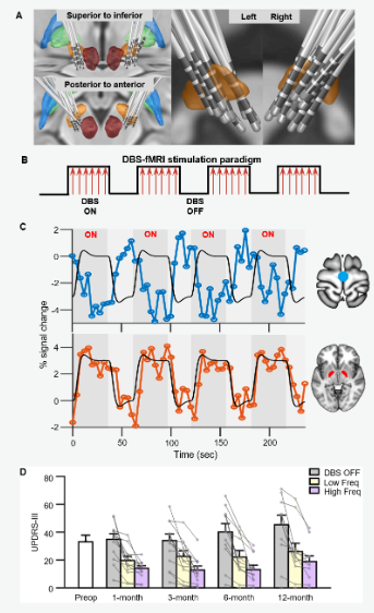 李路明团队历经10年时间设计制造了首个3.0T磁共振兼容的脑起搏器系统,并联合北京天坛医院张建国团队、北京协和医院郭毅团队、齐鲁医院徐淑军团队成功在天坛、协和、齐鲁三家医院完成14名帕金森病患者的植入手术,并进行了为期一年的基于磁共振的脑功能研究。在本次研究中,刺激器植入人体后会周期性地刺激患者的丘脑底核,同时用功能磁共振的方法同步记录大脑的即时响应,结合刘河生团队开发的最新的磁共振信号处理技术,可以准确定位出大脑中那些对电刺激做出响应的功能网络,实现了对脑深部电刺激调控的神经通路的刻画。