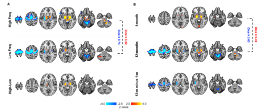 在本研究中,研究团队首先展示了功能磁共振对个体水平的神经通路的定位结果,验证了方法的可靠性;通过术后与术前功能磁共振的对比,首次发现了对电刺激作出不同响应的两条神经通路——分别是被电刺激激活的苍白球内侧部-丘脑腹外侧-小脑深部核团通路和被电刺激抑制的主运动皮层(M1)-壳核-小脑前叶通路。首次观察到小脑对脑深部电刺激作出响应时与大脑皮层、基底节核团之间的协同关系,揭示了两个小脑结构在治疗帕金森病中起到的重要作用。通过高频与低频刺激的对比、术后1月与12月的对比,发现了两条神经通路在频率选择性与可塑性上具有不同特点:其中苍白球通路对刺激频率敏感,但对治疗时间不敏感,该通路对高频电刺激有更强烈的响应,响应幅度在12个月内基本保持不变;M1通路则对刺激频率不敏感,但是对治疗时间敏感,在术后经过一段治疗后(>6月)才对刺激作出响应;表明两条神经通路不仅在空间上分立,在功能上也相互独立。尤为重要的是,论文研究表明新发现的两条神经通路分别与帕金森病患者的不同运动症状改善密切相关,这些结果在新疗法的开发与患者术后的刺激参数管理上有着重要的应用前景,有助于进一步提高帕金森病患者的生活质量。