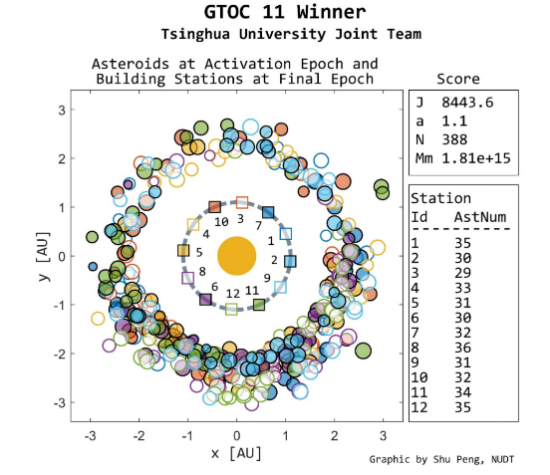 宝音贺西教授和蒋方华副教授所带领的航天动力学实验室(Laboratory of Astrodynamics,简称“LAD”)与航天八院509所成员组成。团队对8万多颗小行星进行了优化筛选并建立星链,将连续推力轨迹优化和“戴森环”轨道设计难题进行分解和近似,提出高效的分站策略,实现到达太空发电站的小行星质量最优分布。依靠团队通过长期科研攻关积累的高效率优化算法,对小行星探访进行了全局探索与优化,给出清华方案。