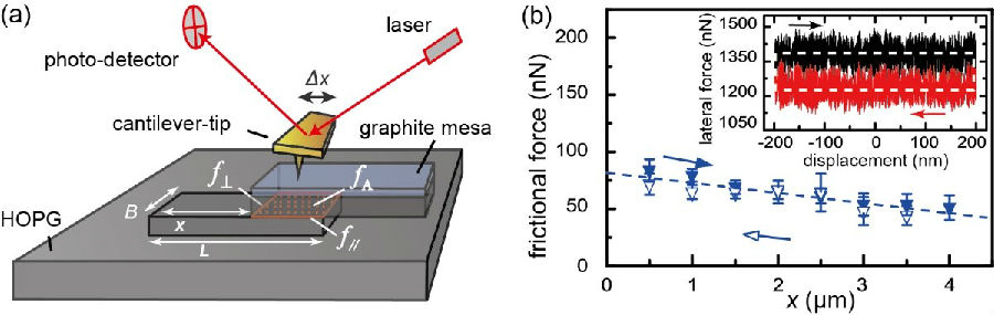 a)使用原子力显微镜操纵石墨岛,测量石墨超滑接触在不同接触面积与接触周长条件下的摩擦力。(b)摩擦力与X成线性关系,通过其斜率与截距可测出接触面内部与接触边缘各自对摩擦的贡献。