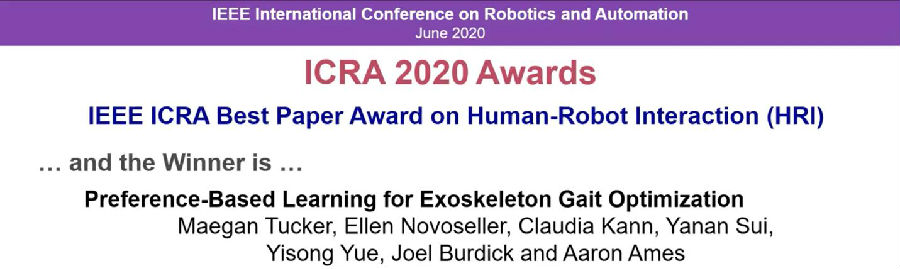 助理教授眭亚楠与美国加州理工学院的合作者发表了题为“基于偏好反馈的外骨骼步态优化学习”(Preference-Based Learning for Exoskeleton Gait Optimization)的研究论文,获得大会唯一最佳论文奖,并同时获得最佳人机交互论文奖。