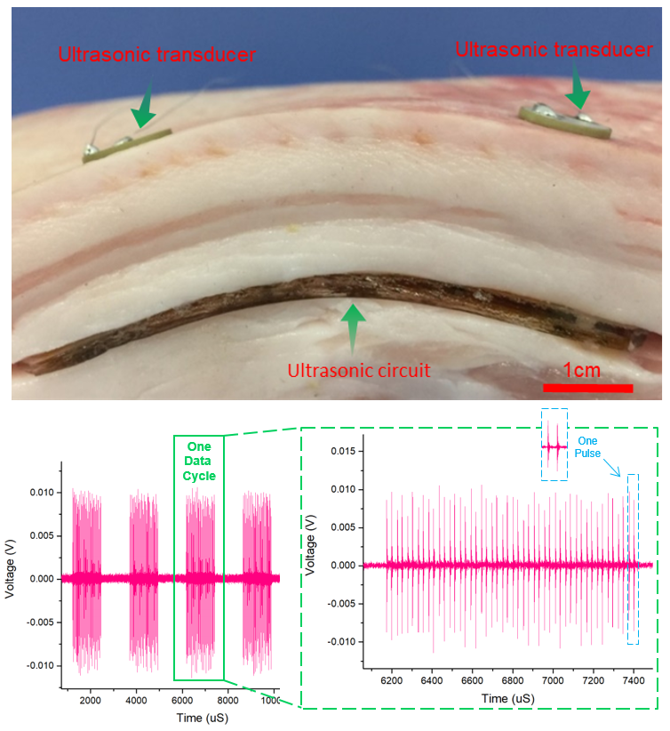 、柔性电子技术研究中心冯雪教授课题组基于超声所具有的波长短、换能器小、组织穿透距离深和能量转化效率高等优势,结合柔性超声技术和柔性电路技术,研发了一种柔性可延展超声阵列及系统,可在换能器尺寸小型化的同时兼具高效能量传输性能的优势,其在植入体内后,可接收超声波的机械能并将之转换为电能使系统工作。系统内置传感、计算分析等模块,可实时监测体内生理状态信息,并将采集的生理信息通过超声波编码进行无线数据传输,进而实现了无线生理遥测。相比于商用心脏起搏器,该器件的体积缩小了28倍,且结合柔性可延展的力学设计和轻薄柔软的高生物兼容性封装,使得该植入式器件在长期监护过程中给患者带来极大的舒适性且大大减小了并发症风险。