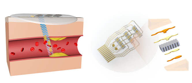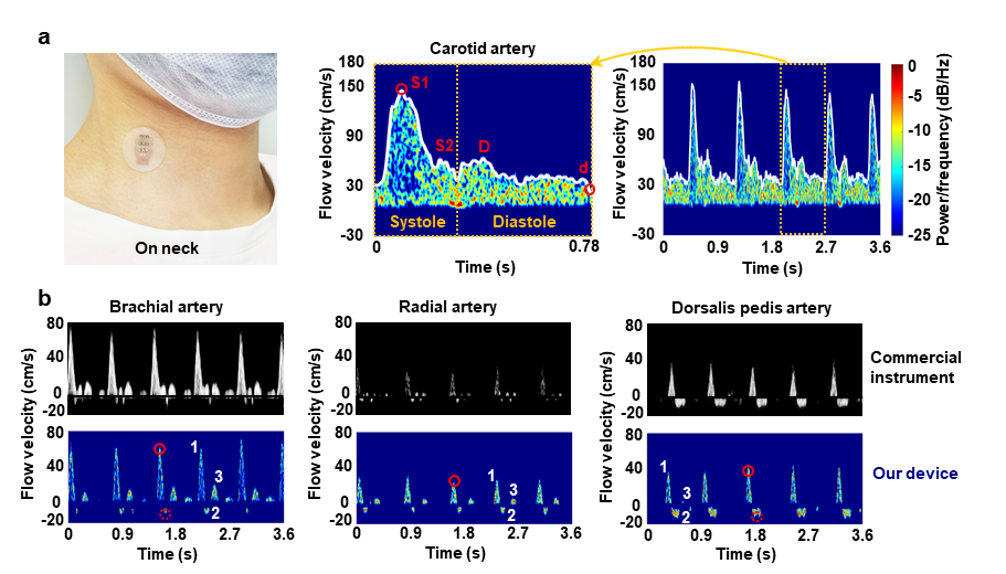 、柔性电子技术研究中心冯雪教授课题组研发了一种柔性压电换能器阵列,通过集成1-3型压电复合材料、蛇形导线和低模量弹性硅胶,使得器件具备柔性与可拉伸性,可共形贴附于皮肤表面,与皮肤声耦合良好,克服了现有超声器件无拉伸性、无法与皮肤贴合、需要耦合剂等难题。多阵元设计有助于尽可能覆盖待检测的血管,确保超声束穿过血流,减少手动操作,自动化寻找位置。超声波发射频率影响探测深度及多普勒散射强度,研究者采用5MHz压电换能器,以实现对颈动脉血流具有最佳探测信噪比。