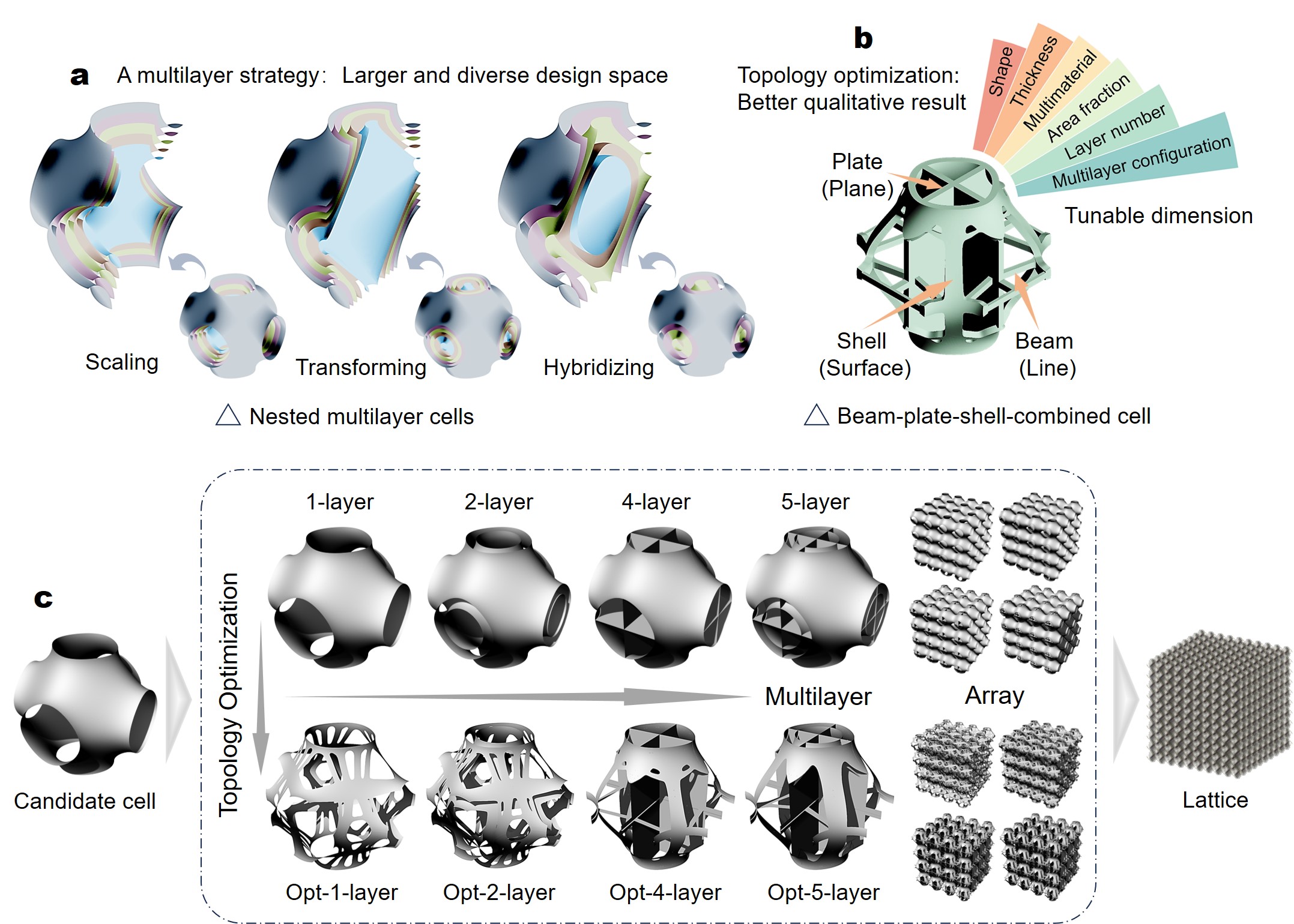 相关研究成果以“基于多层策略和拓扑优化生成的超刚性力学超材料”(Ultrastiff metamaterials generated through a multilayer strategy and topology optimization)为题,于4月6日发表于《自然·通讯》(Nature Communications)。
