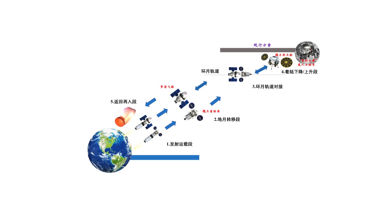 图1是2030年载人登月的运输系统方案,在这个方案中,所有飞行器都是一次性使用的。图2给出了三种航班化运动大系统构成方案,分别是利用现有空间站、经由月球轨道站中转、和同时经由空间站和月球轨道站中转。第二和三种方案和月面长期驻留的任务目标相契合,第三种方案也最具经济性,但都需要以月面可以提供飞行器燃料为前提条件。