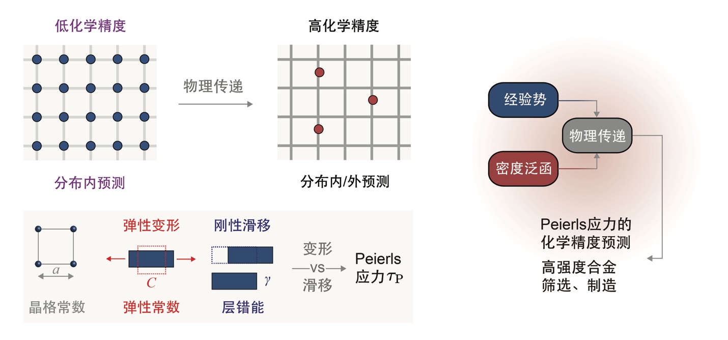徐志平课题组提出物理传递学习理论框架,以解决在预测合金强度时精度与效率难以兼顾的难题。该框架仅需基于少量化学精度理论计算数据,即可实现金属合金强度的高精度筛选。在理论预测引导下,课题组与中国科学院研究团队合作,通过高通量离子束沉积技术,首次制备出传统方法难以获得的高强度亚稳态二元合金,为合金材料开发开辟了新路径。
