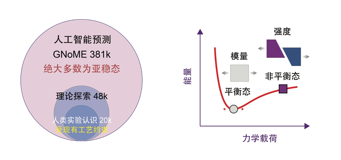 在物质科学领域,高强度合金的预测与制备是长期面临挑战的重要课题。近年来,基于第一性原理等方法构筑的材料数据库以及机器学习方法的发展改变了新材料的发现方式。基于结构搜索构筑的GNoME、MatterGen等数据库将材料空间从人类有实验认知的数万种拓展至数百万种。值得注意的是,这些被预测的新材料中有许多处于亚稳态,难以在现有工艺条件下获得,针对其物性的探索在很大程度上依赖于理论方法。面对规模庞大的材料数据库以及亚稳态材料制造的困难,兼具精度和效率的材料筛选方法是凸显的挑战,尤其在评估强度等材料非平衡物性等任务中,因其无法从平衡态物性中进行推断,需要引入新的研究思路(图1)。