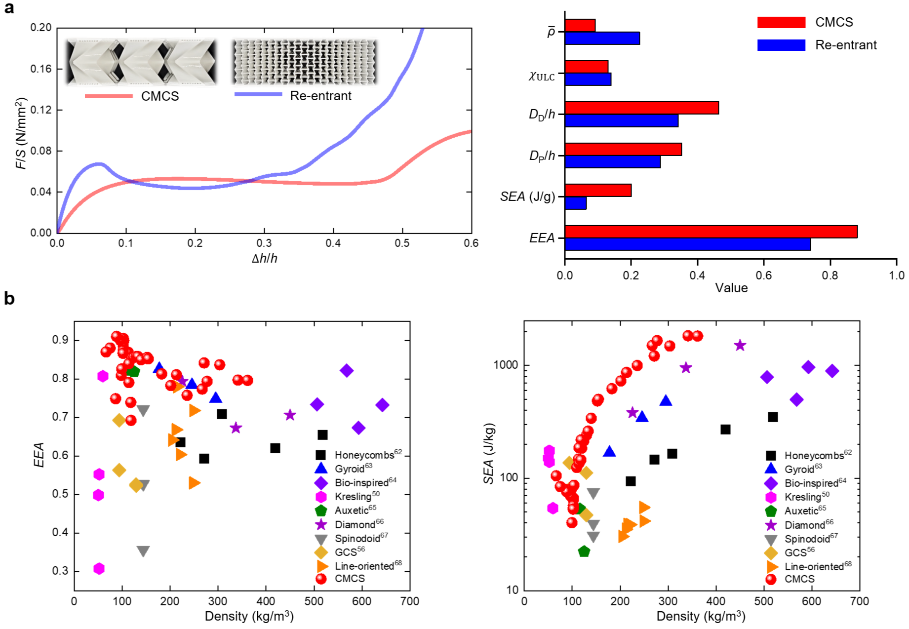 图2.手性多曲壳(Chiral Multi-Curved Shell,CMCS)超材料与其他吸能超材料的对比;(a)CMCS与内凹超材料在吸能效率EEA、比吸能SEA、平台段、致密化位移、荷载波动系数与相对密度方面的比对;(b)CMCS与其他现有吸能超材料在吸能效率EEA和比吸能SEA方面的对比