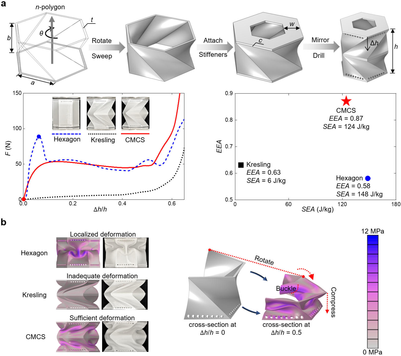 图1.手性多曲壳(Chiral Multi-Curved Shell,CMCS)超材料;(a)CMCS超材料构造方式及其吸能曲线、吸能效率EEA和比吸能SEA与六边形和Kresling超材料的对比(三者质量与特征参数相同);(b)应力云图与压缩-旋转-屈曲变形模式