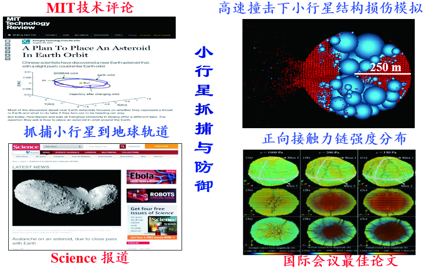 小行星抓捕与防御:研究低能量抓捕小行星到地球轨道附近进行太空资源开发(左图)和高速撞击威胁地球小行星的损伤机理(右图)